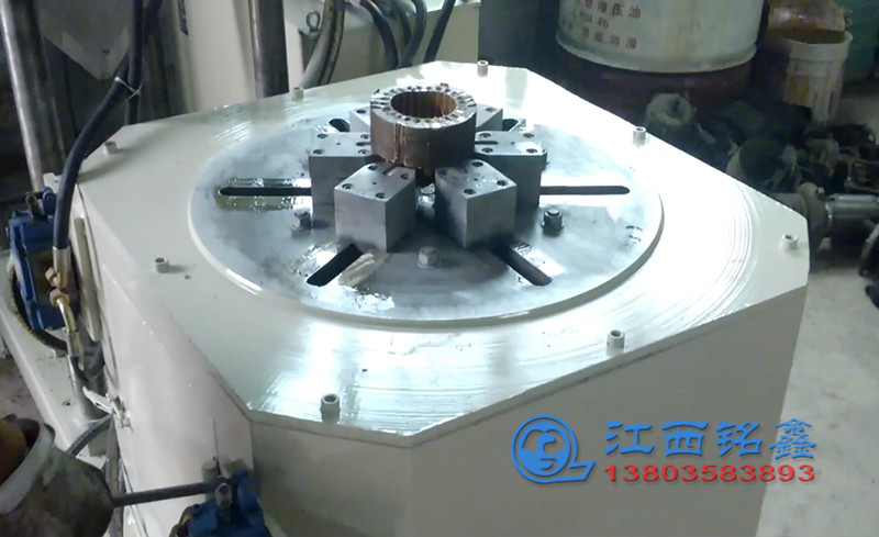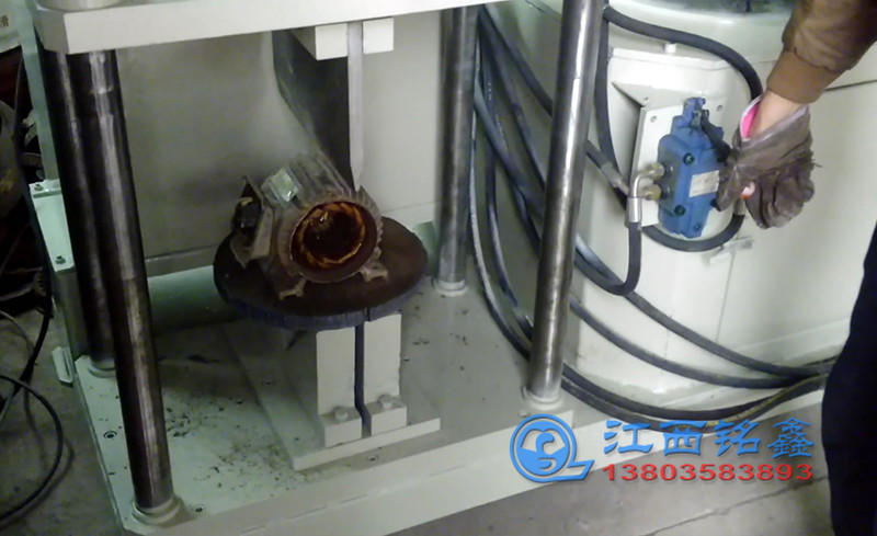 廢舊電機(jī)定子切割分離機(jī)采用液壓系統(tǒng)工作,用一個主油缸上下移動,通過更換不同工裝,可分別將電動機(jī)定子機(jī)座(限于鑄鐵機(jī)座)和定子圓筒形鐵芯破切成兩半,在另一工位可將定子圓筒形鐵芯中的銅線繞組拉出,使電動機(jī)定子中的鑄鐵,矽鋼片,銅芯線三部分分開,完成電動機(jī)定子破拆過程。