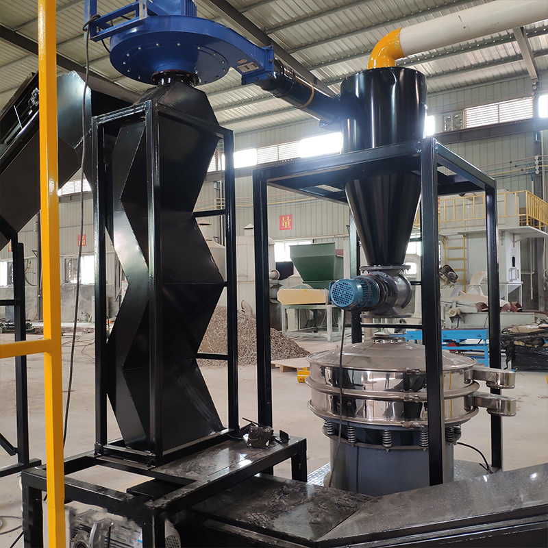 由輸送機將物料送入一級破碎機中進行粗破碎,粗破碎后的物料再通過輸送機送入二級破碎機中進行第二次破碎,二級破碎機破碎后的物料進入到輸送機中同時設置磁選設備,可以將物料中的鐵分選出來。物料輸送機和磁選器去除鐵后,進入到三級破碎機中進行細破碎,將物料破碎至粉末。粉末狀態的物料由負壓系統進入到旋風分離器中進行空氣過濾,并通過風機落至氣流分選機上,由氣流分選機分選,使不同密度的物質進行分層,最后得到金屬分選出來,而所有的非金屬由負壓系統帶入脈沖除塵器進行集中。而過濾得到的尾氣將繼續由負壓系統送入到尾氣處理設備中進行空氣凈化,使之達到國家排放標準后再進行高空排放。
