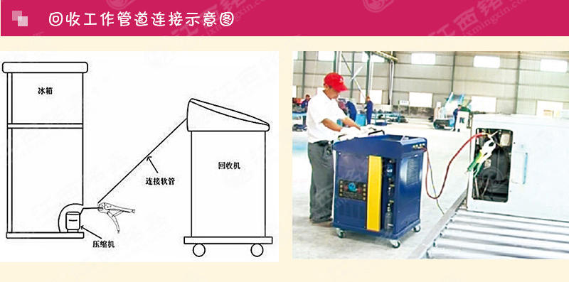 利用壓縮機將制冷系統的制冷劑回收到設備內過濾、干燥、分離潤滑油,壓縮成氣態制冷劑,進入冷凝器冷卻成液態,儲存到工作罐中,等待重新利用。這樣既保護了環境,又增加了經濟效益。
