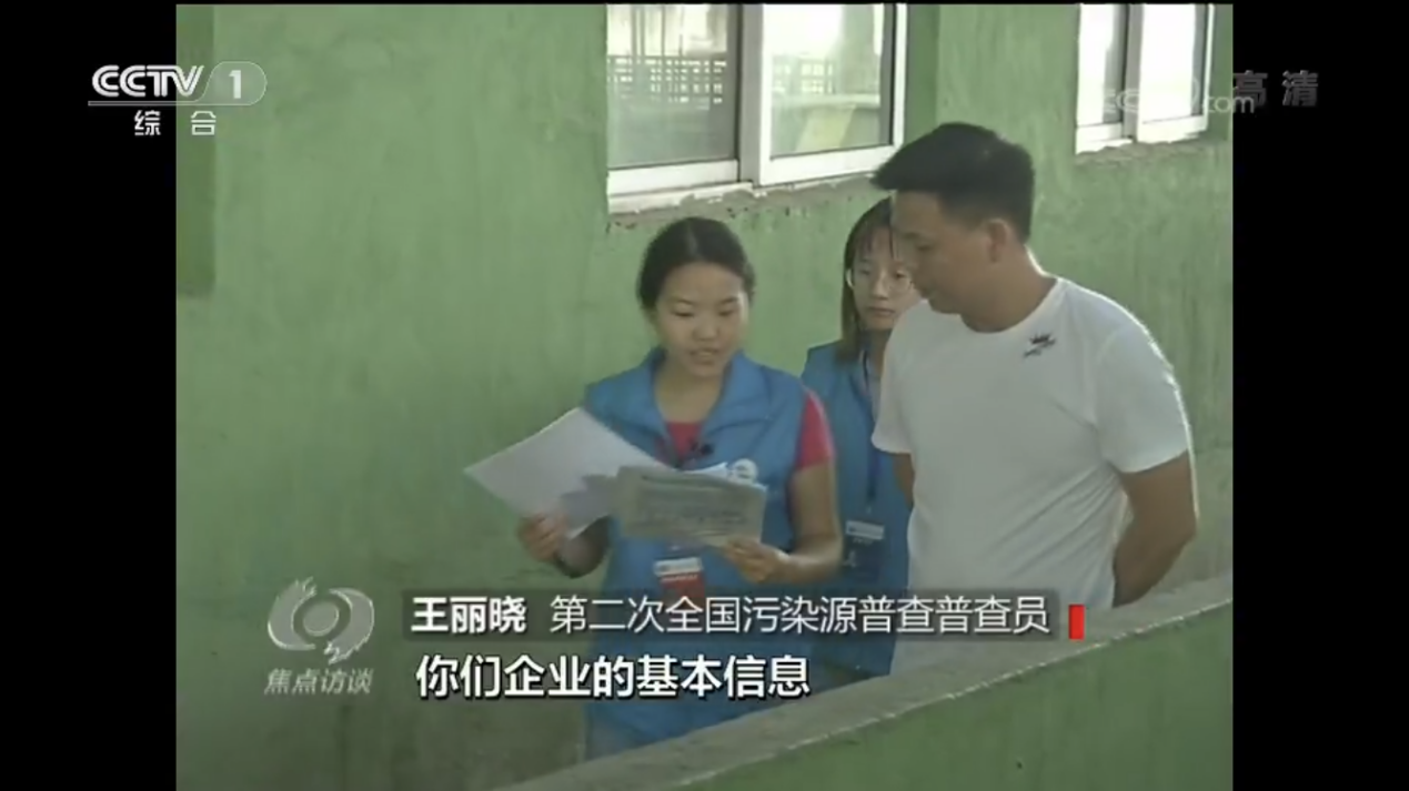 7月22日晚上19點40分,央視《焦點訪談》欄目播出“摸清家底、精準治污”節(jié)目,報道了正在開展的全國第二次污染源普查工作。我公司作為開展具體工作的第三方機構接受了欄目中的采訪和報道,節(jié)目播出了朱彬董事長和唐慶蟬主任分別就污染普查工作接受了記者采訪的內容,節(jié)目還對王麗曉和王笑的日常入戶調查工作進行了詳細報道和介紹,整體出境時長約達4分半鐘。
