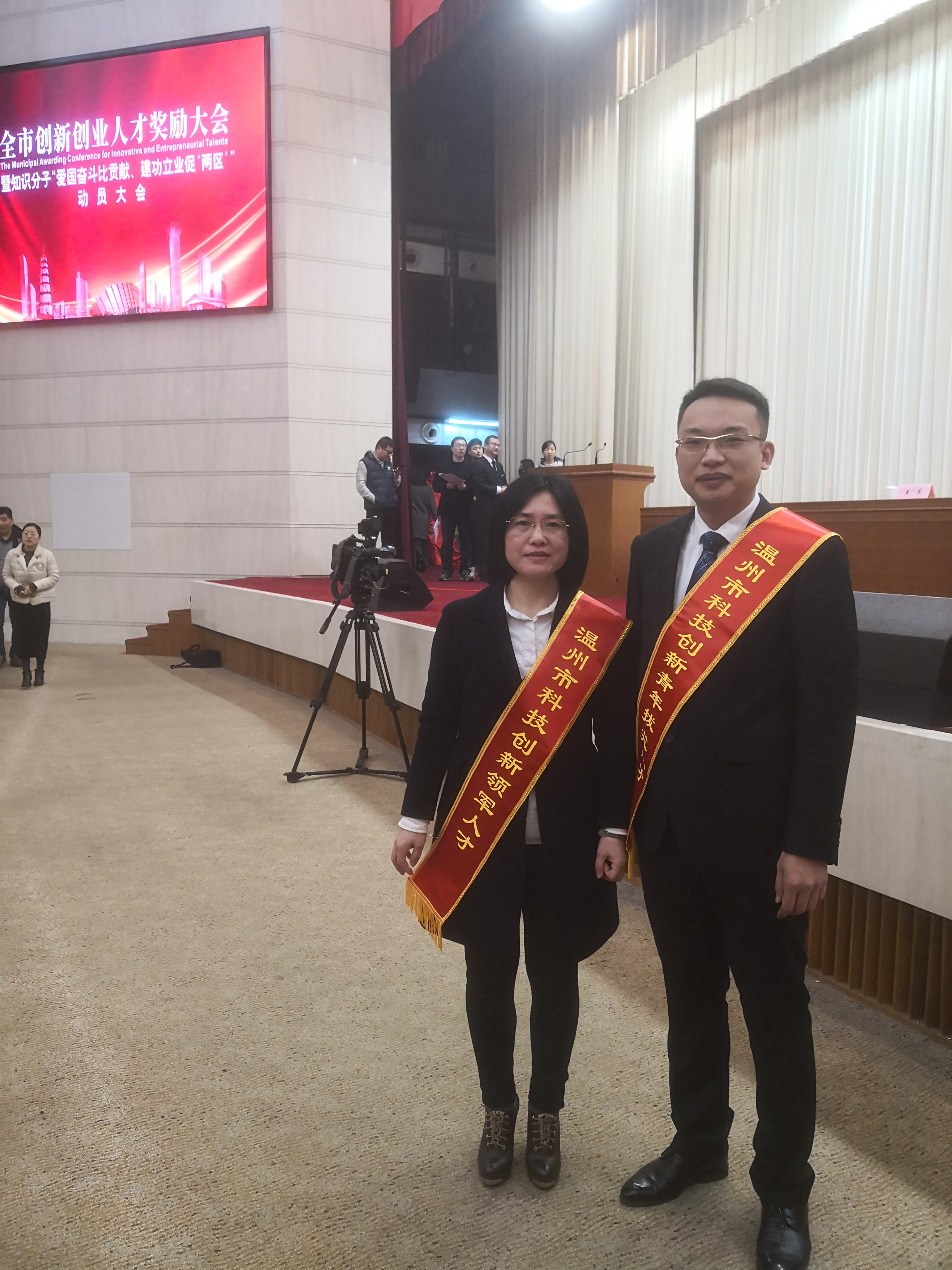 2月26日上午,由市委市政府組織召開的全市創新創業人才獎勵大會在市人民大會堂召開。我公司宋躍群和葉舒帆同志分別入選溫州市首批“科技創新領軍人才”和“科技創新青年拔尖人才”,在會上獲得了隆重的表彰。