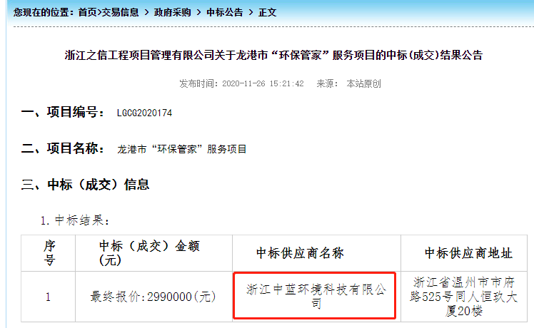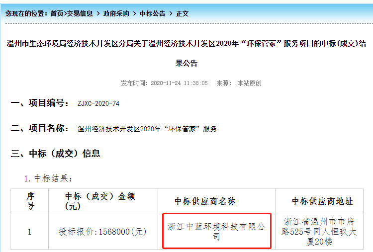 11月下旬,我公司通過公開招投標,成功中標溫州市經開區與龍港市兩地環保管家項目。此次中標為中藍環境環保管家團隊開拓了一個全新局面。